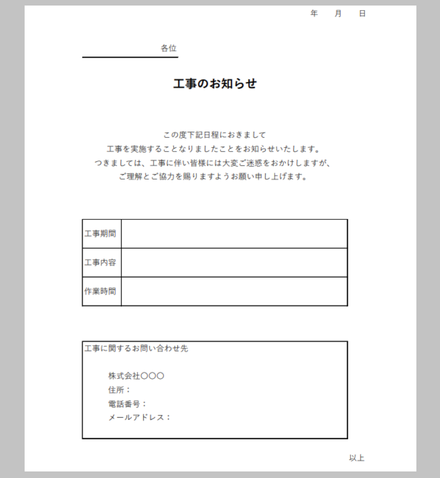 無料テンプレートをダウンロードして、工事の挨拶状を簡単に作成しましょう。近隣へのご配慮や問い合わせ先についての文例も含まれています。ぜひご利用ください。